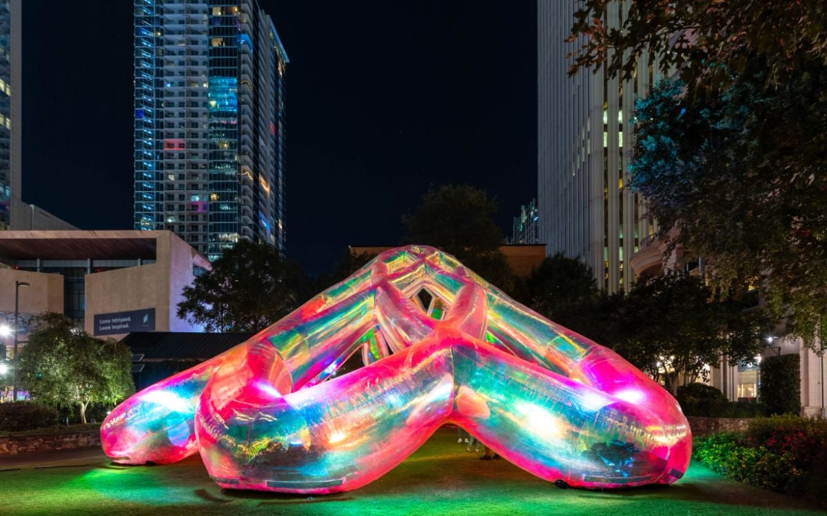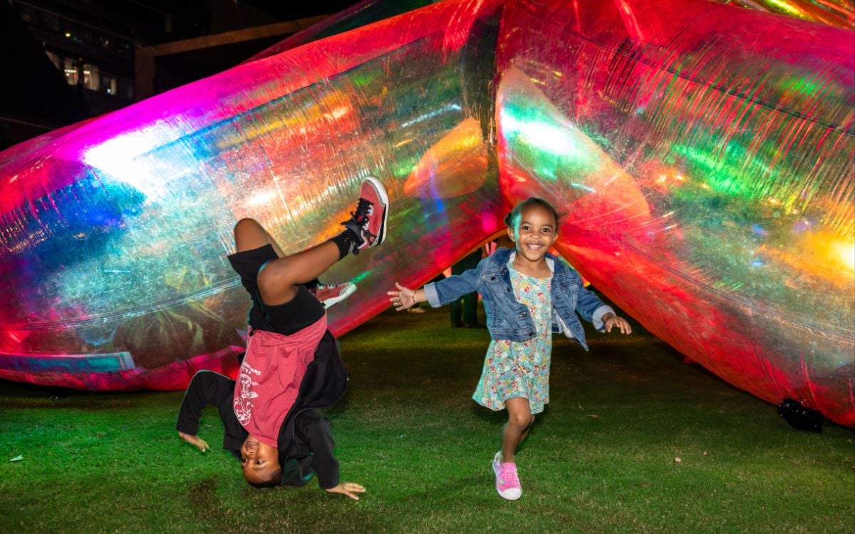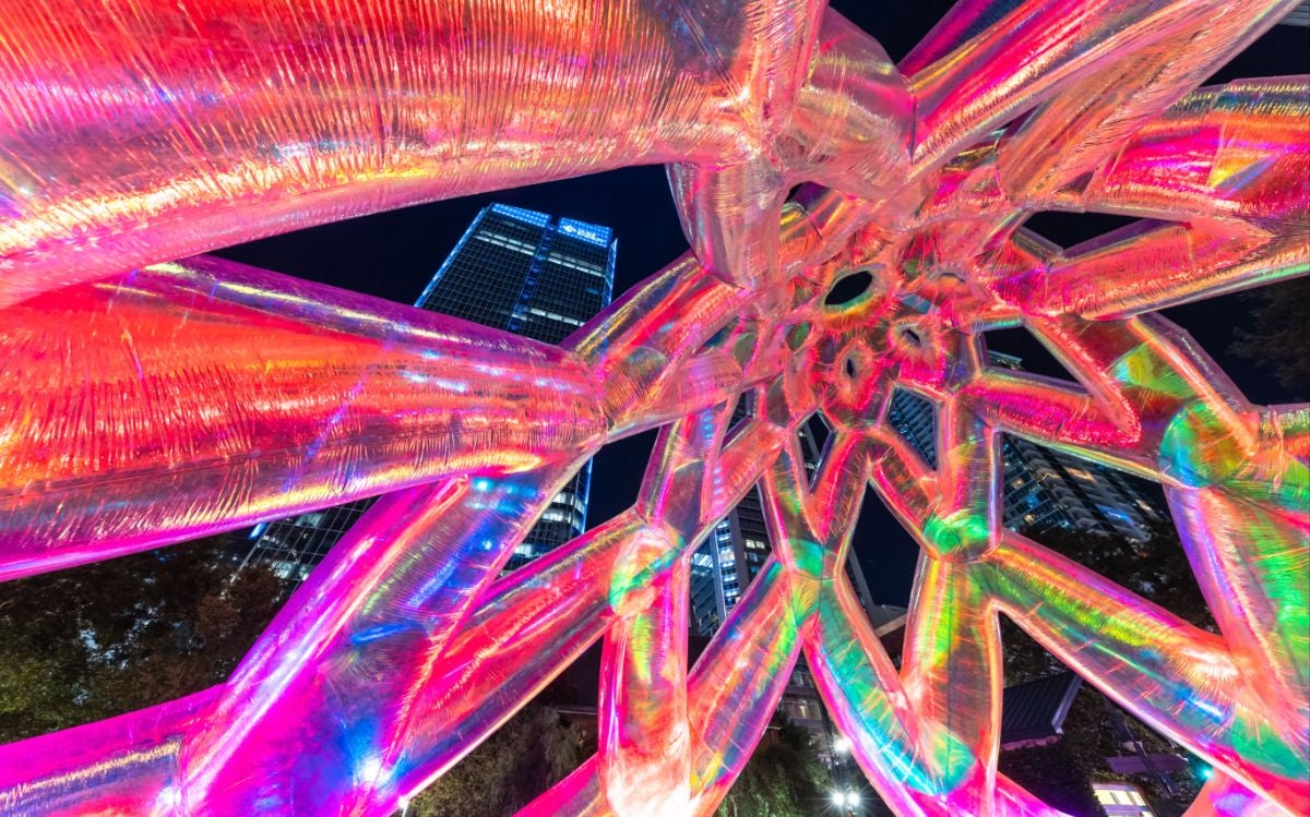 Meliora is a temporary public art-chitecture. It exists as a space of reflection, immersion and joy for its audience. It is an abstract representation of how the global community has the power to come together to cooperate in times of need and is making its world premiere at Enlighten 2025.